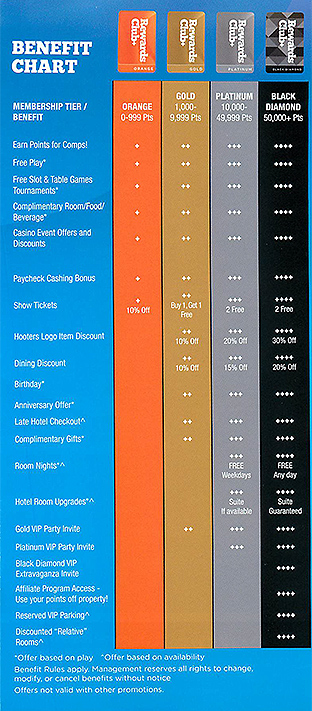 We are proud to introduce our new, tiered Rewards Club+ here at Hooters Casino Hotel! Membership to the club definitely has its perks and the more you play, the more benefits and comps you'll receive. If you haven't already done so, stop by the Rewards Club+ and get your new card today where NEW MEMBERS CAN GET UP TO $500 IN FREE SLOT PLAY!