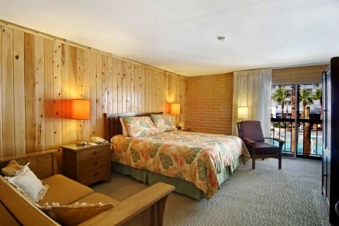 This 325 square foot room features either a king or two double beds. This room features a balcony overlooking the pool or a sliding door with access to the pool. The room is equipped with a desk and chair, armoire with a television, and a table with bar stools.