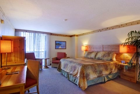 Our Tower Rooms feature soothing tones that evoke a getaway on a tranquil bay. This 350 square foot room features either a king or two double beds. The room is equipped with a desk and chair, armoire with a television, and a table with bar stools.